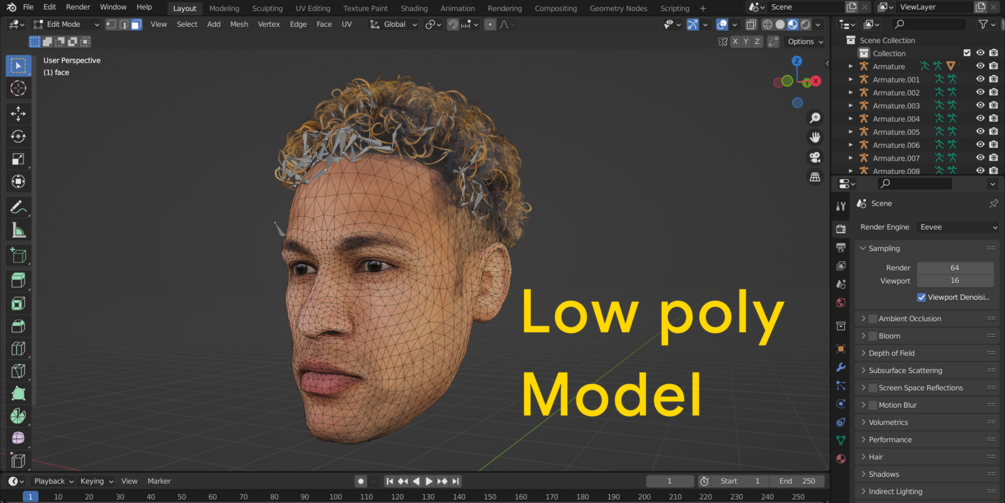 This is the low poly 3D model of Neymar Jr which can be used as a face mask for Instagram or Snapchat filters. The model is very much high-quality textures and with facial expressions. and bones in hairs for physics.